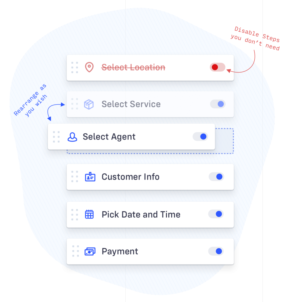 We realize that every business is different, with that in mind we’ve created a unique interface where you can disable steps you don’t need or rearrange the order of steps. For example you can capture customer information before they pick anything, this way you can contact them later if they never finished the booking process.