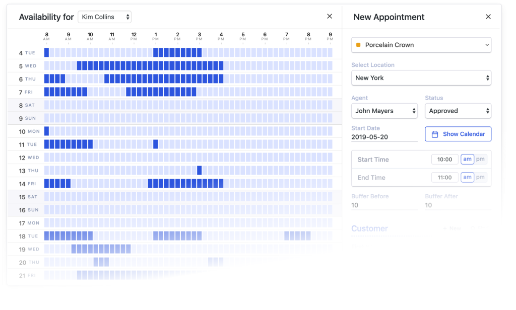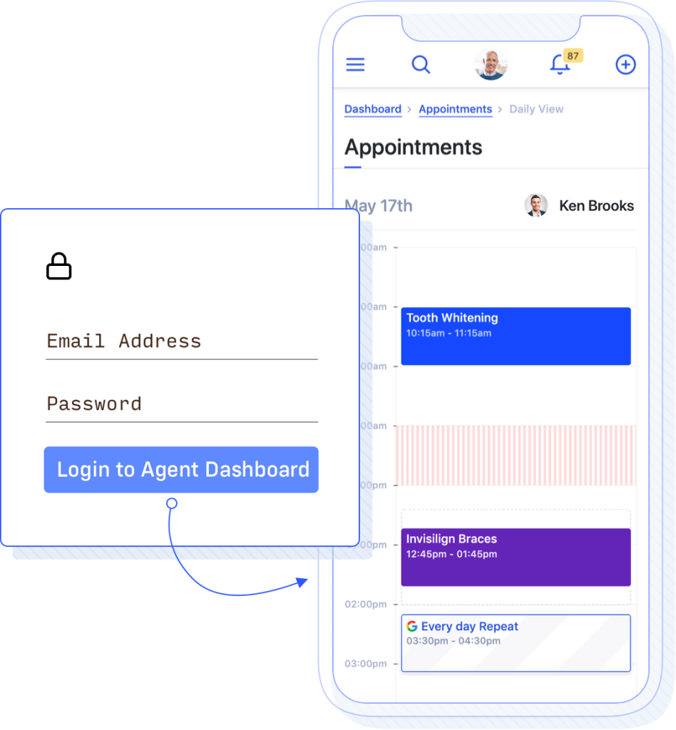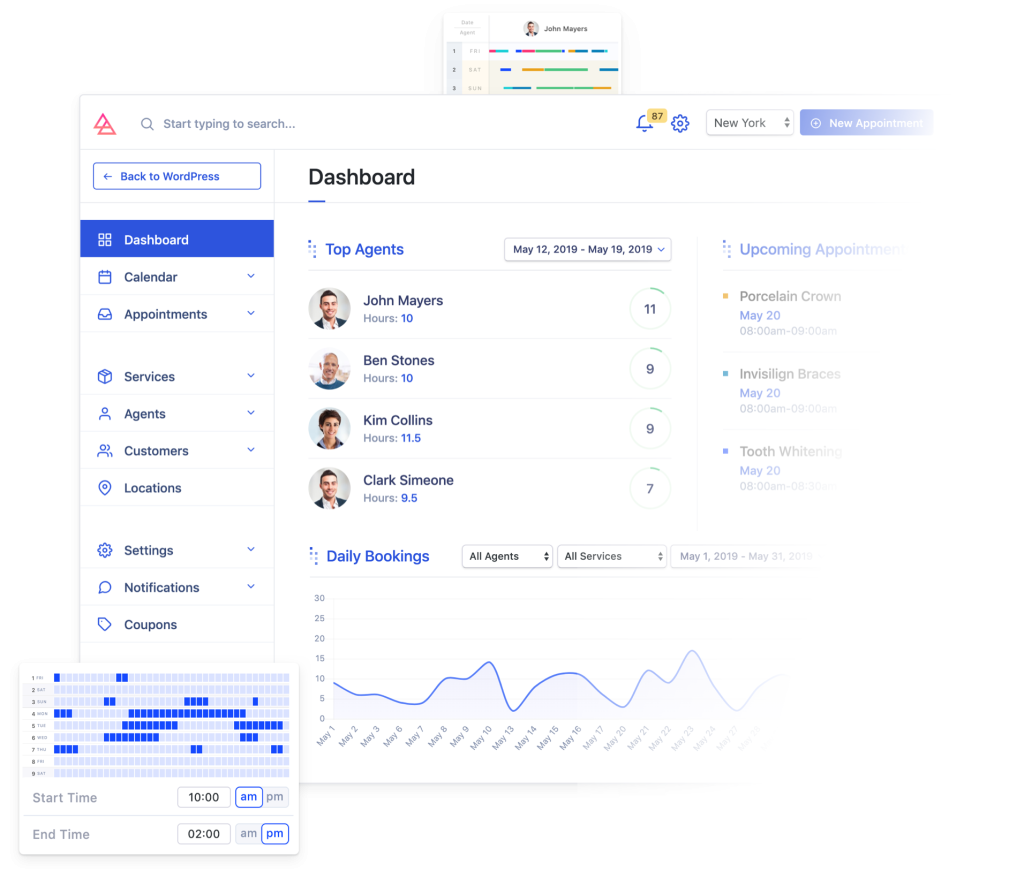 Our dashboard will give you insights into your business. It will show you top performing agents, how busy they are, upcoming appointments, charts with important booking information and more.