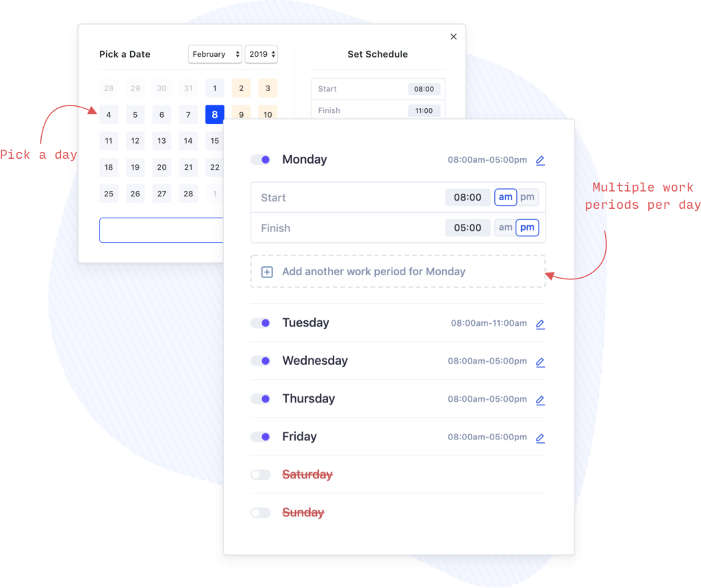 Customizable work schedules for each agent and service, custom days off, holidays and selected days with custom schedule.
